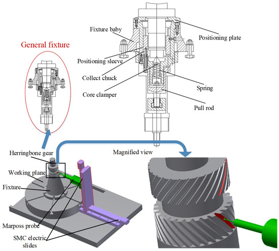 To clamp the herringbone gear and ensure the accuracy and efficiency of herringbone gear machining, a general fixture for hydraulic drive self-clamping is designed; it is composed of a pull rod, core clamper, spring, collect chuck, positioning sleeve, fixture body, etc., as shown in Figure 9. When the hydraulic cylinder drives the pull rod downward, the pull rod drives the collect chuck to clamp the shaft diameter of the herringbone gear and ensures that the positioning surface of the herringbone gear is attached to the positioning plane of the fixture, in order to facilitate automatic clamping of the herringbone gear. Table 1 lists the basic parameters of the herringbone gear.