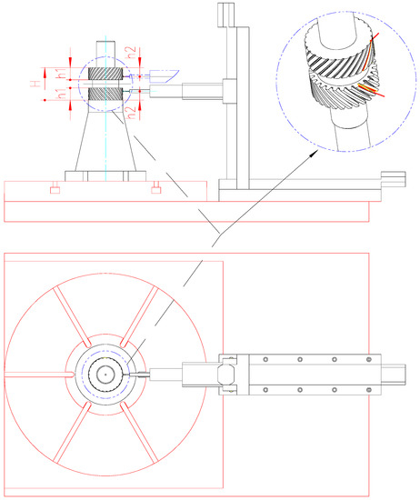 The detection principle and process of the device are as follows. The NC program controls the electric slides to turn the measuring head into the left-handed slot of the gear (as shown in Figure 9). After measuring the tooth centers of the up and down gears, an initial processing angle will be compensated and corrected according to the center deviation value to meet the requirements of symmetry.