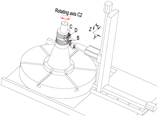 Meanwhile, an on-line spatial symmetry error measuring device controlled by the program of an NC system is designed to measure points on surfaces of the machining teeth. The symmetry center plane can be calculated based on the proposed method. As shown in Figure 9, the on-line measuring device is composed of a Marposs T25 probe and two electric slides [28]. The horizontal and vertical electric slides allow multi-degree freedom of movement of the Marposs probe. On that basis, measurements of gears of different heights and sizes can be realized.