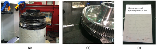 Based on the proposed machining method, the results of the machining experiments indicated that the symmetry can be reliably controlled within 0.015 mm. As shown in Figure 15a, the machining instances for herringbone gear were extended to other sizes. As shown in Figure 15b, the machining accuracy of symmetry detected by the coordinate measuring machine can be controlled within 0.02 mm with SSEDC. Comparing the traditional and novel machining methods, the contrasting results are shown in Table 2.