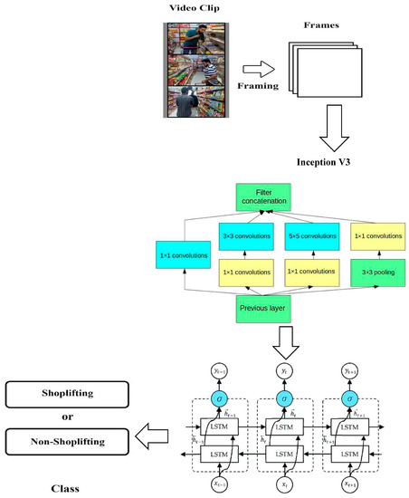 The reason for selecting the Inception model is a convolutional neural network (CNN) architecture known for its ability to capture both local and global features from images effectively. It utilizes a combination of parallel convolutional filters of different sizes, enabling it to capture details at various scales. Shoplifting detection often involves analyzing video frames or images to identify suspicious activities or objects. The Inception model’s robust feature extraction capabilities can be leveraged to capture relevant visual cues, patterns, and object characteristics. By using the Inception model as the visual backbone, the hybrid system can effectively process and understand the visual information from the surveillance footage. In addition, the Inception model has been used and showed exceptional performance for human activity recognition tasks [2,3,12,28].