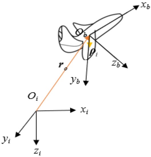 In this paper, the origin of the fuselage coordinate system is chosen as the center of mass of the fuselage, which can avoid the extra additional moment term in the equation and the constant change in the coordinate system caused by the change in the center of mass in the process of wing folding, making the modeling more intuitive and concise. The mass of the foldable wing is concentrated at its center of mass. As shown in Figure 2, is the vector from the ground coordinate system to the body’s center of mass. is the vector from the origin of the body’s center of mass to the center of mass of the foldable wing. Subscript f indicates the fuselage, subscript 1 indicates the left foldable wing, and subscript 2 indicates the right foldable wing. Ri is the vector from the origin of the ground coordinate system to the center of mass of the folded wing.