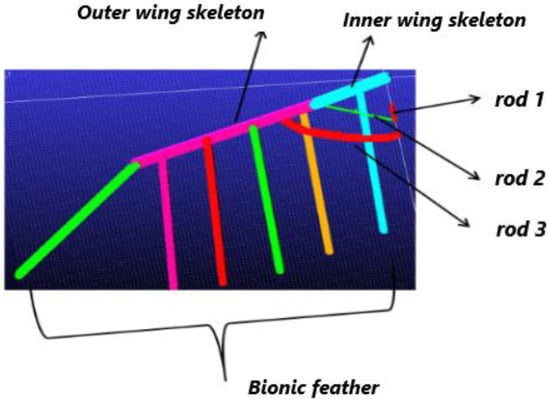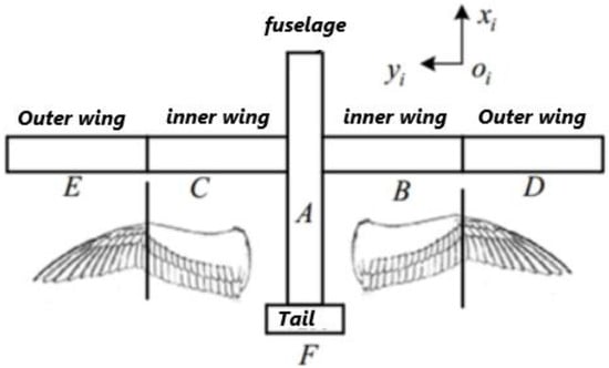 Because of the complex control of birds’ muscles, bones, and flight feathers, it is difficult to design an aircraft control system if the same control method is adopted. Therefore, we simplify the birds with multiple degrees of freedom as a whole and extract the main bionic features to arrange the wings. The simplified configuration of birds can be described by inner wings B and C with secondary flight feathers and outer wings D and E with primary flight feathers, as shown in Figure 6.