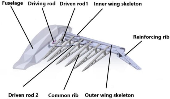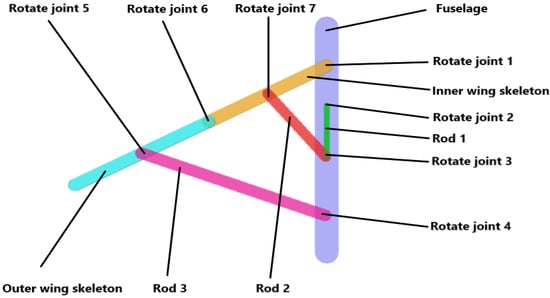 The installation position of the parts is symmetrical along the central axis of the fuselage. We have designed one side of the folding structure, as shown in Figure 11. The folding structure is connected to the fuselage by three rotating joints. The drive lever obtains power from the steering gear and drives the folding wing. The inner and outer wing frames act as load-bearing beams and form a complete airfoil with reinforcing ribs. Driven rod 2 is designed as an arc to avoid interference with other components.