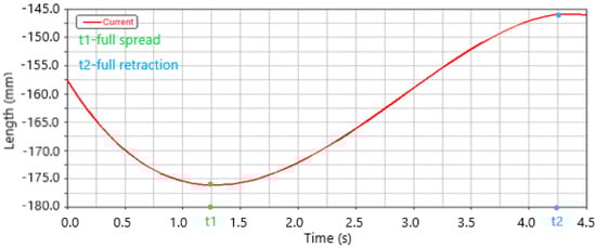 During the actual flight, the unsynchronized movement of the wings will cause the center of gravity to change, which will affect the maneuverability and stability of the aircraft. Therefore, the change range of the center of gravity should be small. When the wing moves symmetrically, the transverse center of gravity of the bionic foldable wing is unchanged, but the change in the position of the center of gravity along the direction of the fuselage will affect its longitudinal stability. The center of gravity of the folding mechanism was calculated. The steering gear driving rod rotates at a uniform speed of 30°/s. When the driving rod rotates 90°, the wing is folded or unfolded. As shown in Figure 14, 1.25~4.25 s is the process of the wing from full spread to full retraction, and the variation range of the center of gravity in this process is controlled within 4 cm.