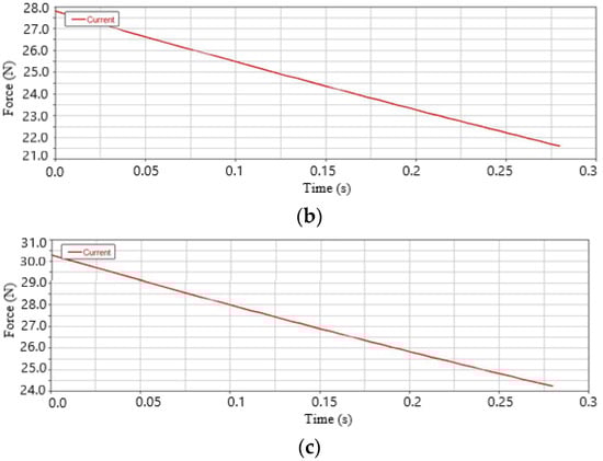 In the structural model, rotary joint 1 connects the inner wing skeleton with the fuselage, rotary joint 6 connects the inner wing skeleton with the outer wing skeleton, and rotary joint 4 connects the fuselage with the connecting rod 3. Under a torque drive of 3 N·m, the impact force on rotary joint 1 is shown in Figure 16, the impact force on rotary joint 6 is shown in Figure 17, and the impact force on rotary joint 4 is shown in Figure 18. The wing is in full extension state at moment 0, and the wing is in full retractable state at the end position of 0.28 s. The impact force is less than 50 N, far less than the performance threshold of material failure, meeting the design requirements.