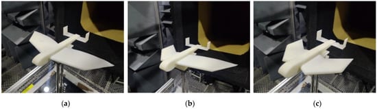 Wind tunnel test models of foldable wing UAV with different attitudes. (a) Wind tunnel test model with wing fully extended; (b) wind tunnel test model of left-wing expansion and right-wing contraction; (c) wind tunnel test model with wing fully folded.