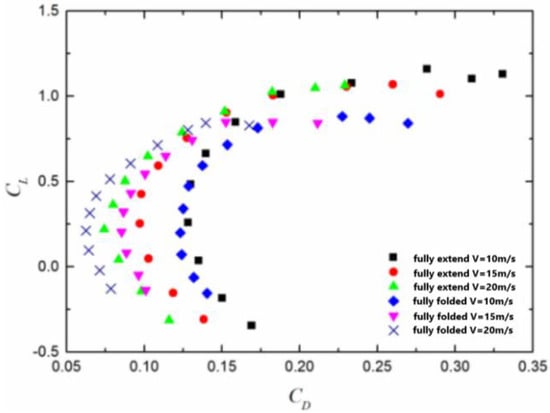 Figure 21 shows the influence of different morphing wing attitudes on the UAV pole curves at three different incoming flow speeds. The experimental results show that the UAV with fully expanded wings has a larger maximum lift coefficient CLmax at the same inflow velocity. At the same incoming flow velocity, in the low lift region, the UAV with fully folded wings has a smaller minimum drag coefficient CDmin, and the minimum drag coefficient CDmin decreases with the increase in incoming flow velocity.