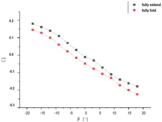 As shown in Figure 23, when the angle of attack = 4°, the rolling moment coefficients of two different wing attitudes vary with the sideslip angle. According to the lateral stability criterion [28], if: