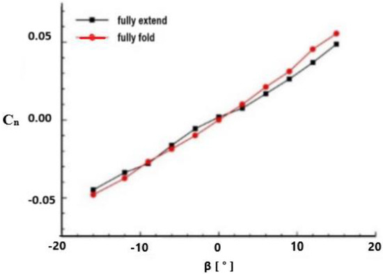 As shown in Figure 24, when the angle of attack = 4°, the yaw moment coefficients of two different wing attitudes vary with the sideslip angle. According to the heading stability criterion [28], if: