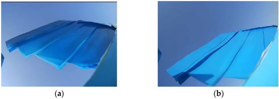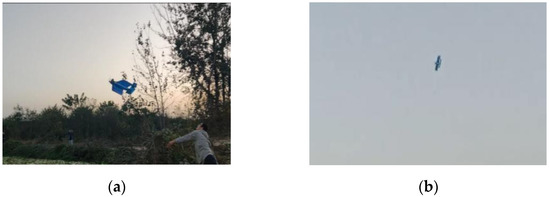 We launched the prototype with a hand toss, as shown in Figure 27a. After attitude adjustment, the bionic folding UAV flew normally. During takeoff and cruise, the deformable wings remained fully extended. In the maneuver stage, one wing is folded and the other wing is fully expanded by remote control to realize the rolling maneuver of the UAV, as shown in Figure 27b. Figure 28 shows the expansion and folding of the left wing in the air as captured by an airborne camera. The flight process showed that the bionic folding wing mechanism can realize the prototype roll through the differential movement of the wing. The symmetrical distribution of wings enabled the prototype to fly stably.