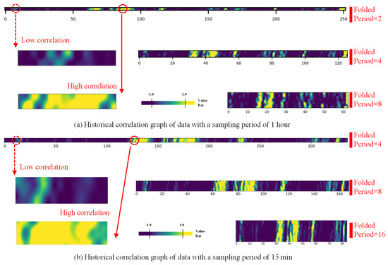 With the sampling frequencies of 15 min and 1 h, sampling time was 2 weeks, and the results are shown in Figure 2. If the historical data correlation graph were displayed point by point, the image would be too long and would not have a good observation effect. The folding period is in {2, 4, 8, 16} data points, and the folded data input is . L is the length of the input sequence. N is the folding period. This correlation graph is more readable.