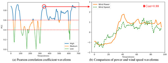 In addition, we took as the sliding time window to select power data and weather data , and calculated the correlation coefficients represented by wind speed and wind power output separately. We obtained the correlation waveform within 2 weeks, as shown in in Figure 3a.