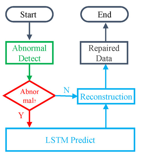 In the process of data sampling, in addition to losing data, abnormal data often appear. The characteristics of these data obviously deviate from the data in other locations, and may introduce significant interference to the prediction algorithm. Therefore, it is necessary to repair these abnormal data. Because these abnormal points generally occur with low frequency and short duration [36], after abnormal data are detected, the LSTM time series algorithm can be used to predict the location data of abnormal data according to historical data information, and the predicted value can replace the abnormal data to complete the data repair process [37,38,39]. The specific process is shown in Figure 4.