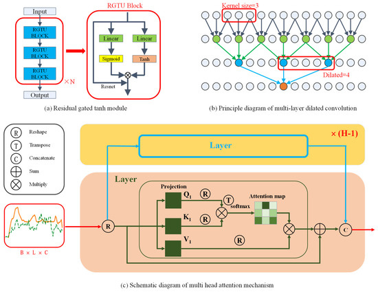 The specific structure is shown in Figure 5c. In the figure, the multi-head attention mechanism is composed of H-layer single-head attention layers in parallel. After being transformed, the input information is mapped to different attention layers in the H layer for attention matrix calculation, and, finally, concatenated for output, i.e., the processed data with H subspaces after Reshape. B is the data batchsize. L is the length of data. C is the channel dimension. H is the head of attention. E = C/H is the feature dimension of each head. In the single-head attention mechanism, such input data can be directly processed. However, in the multi-head attention mechanism, dimensions need to be reorganized. Adopting a multi-head attention mechanism can pay attention to different spatial information in different positions by mapping multiple subspaces, so as to capture more abundant feature information.