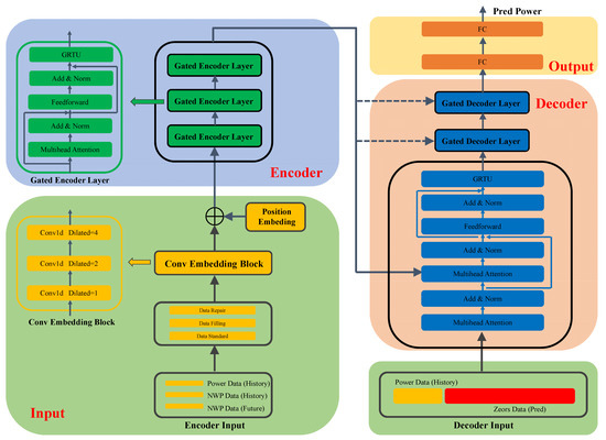 The Encoder module is mainly composed of multiple Encoder layers connected in series, and the number of layers can be set freely. In this paper, a three-layer structure is adopted. Each layer includes a multi-head attention mechanism, residual and regularization network, linear feedforward network, and GRTU module. The multi-head attention mechanism is set to 8 heads. The module can focus the input multi-dimensional feature information with attention weights, and output the attention diagram of to Decoder, helping Decoder to complete the final power prediction.