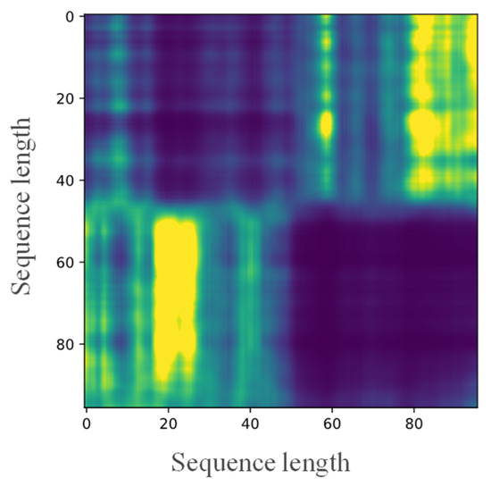 In other words, the Encoder module is the core of the entire model. It can analyze and extract the features of input sequences, and utilize gating systems and attention mechanisms to efficiently capture the core intrinsic features of the data, thereby helping the Decoder to complete sequence prediction. As the Encoder outputs an attention weight map, it reflects the distribution of key information in the sequence. To facilitate understanding and observation, the output was visualized and shown in Figure 7. The figure shows the encoder output with an input length sequence of 96. It can be seen that the attention in the first and second half of the sequence is focused on itself, respectively. The poor attention at the front and back ends also reflects a low correlation.