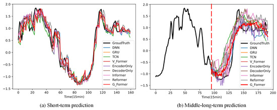 In medium–long-term prediction, experiments take the input sequence length of 96 and the predicted sequence length of 96 as an example to visualize and obtain the image, as shown in Figure 8b. It can be seen that, in the medium- to long-term prediction process, G-Former has the best prediction waveform.