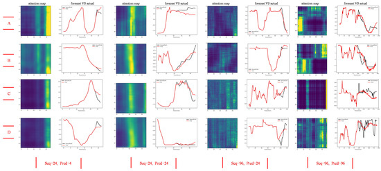 Comparison of predicted waveforms of different models. All data are standardized by Z-Score. The sampling period is 15 min. Each group of experimental results consists of an attention map of the input sequence and a comparison map of actual power and predicted power. (A–D) is the randomly selected four sets of experimental data.