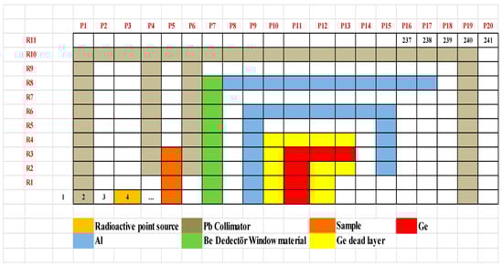 Figure 1 shows a series of cylindrical circular projectiles, each with a radius represented by R1, R2, …, R11 and planes represented by P1, P2, …, P20. A part of the code was created for the point radioactive source in a manner where all photons were released over the z-axis, giving a beam of collimated photons [