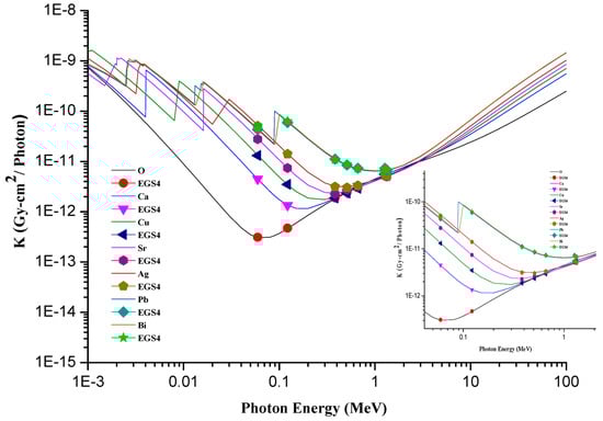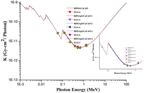 Figure 8. It is clear that the kerma coefficients of the BiPbSrCaCuO superconductors are almost the same for all energies. The behavior of the kerma coefficient curves with respect to gamma-ray energy is determined by the relative contributions of various partial photon interaction processes such as the photoelectric effect, Compton scattering, and pair production. The contribution of each process depends on the photon energy and the atomic number of the absorber material. In the intermediate energy region, as the photon energy increases, the contribution of Compton scattering and pair production increases relative to the photoelectric effect, resulting in a decrease in the kerma coefficient.