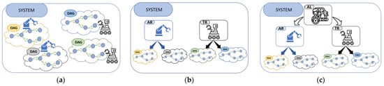 DAG organization according to different criteria: (a) Unrelated DAGs in the system; (b) DAGs organized by robot, Assembly Robot (AR) and Transport Robot (TR) and (c) DAGs organized by Assembly Line (AL). Icons made by Eucalyp and manshagraphics from www.flaticon.com (accessed on 6 June 2023).