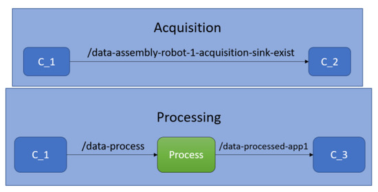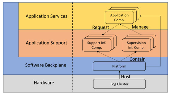 OpenFog defines Fog Applications (herein, applications) as being “composed of a loosely coupled collection of microservices” [7] (p. 85). The microservice paradigm used to design applications is based on separating the application logic into smaller independent, executable, scalable and upgradeable elements (i.e., microservices) that work together to achieve the goal of the application [12,13,14]. Therefore, we align with the OpenFog consideration of Fog applications as a collection of microservices and focus on the separation of concerns between the development of the application components and the design of applications.