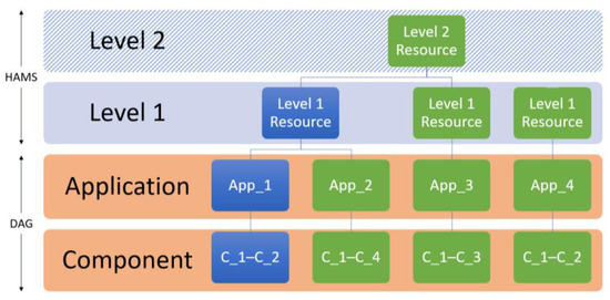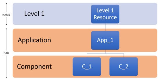 The starting point is the two levels usually considered in DAGs (Application and Component), to which N additional levels are added that allow for the management of applications at different levels. Therefore, we define the Application Structure concept as the composition of the two DAG levels and the N HAMS upper levels. In general, each level acts as a manager of the elements of its lower level. As an instance, Figure 4 shows an example of a HAMS where N = 1. An application formed by two components is assigned to a Level 1 Resource.