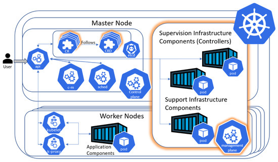 Figure 6 shows how the Kubernetes cluster is extended to include our proposal. The native Kubernetes control plane is divided into the control plane and the management plane. The control plane is responsible for orchestrating the new resources deployed in the cluster. The CRDs and the CRs that are instantiated based on the definition provided by the CRDs are stored inside of the etcd database.