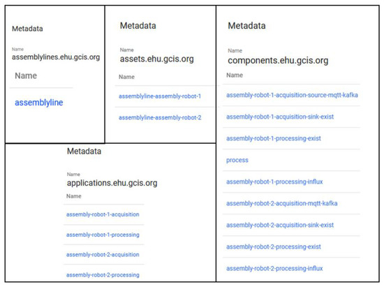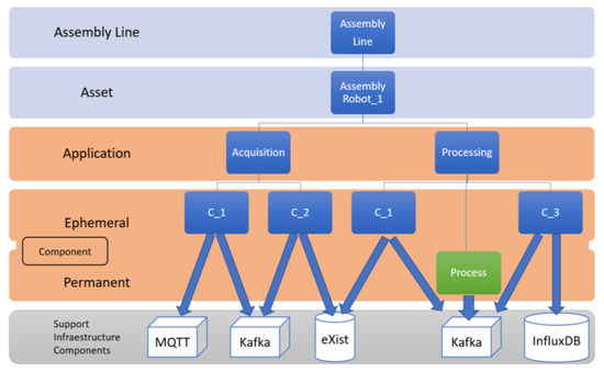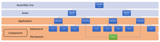 The first step to implementing the platform is to define the HAMS. To do so, the organizational and business needs must be analyzed. As stated in the previous subsection, the testbed is composed of industrial robots and their digital twins, considered manufacturing assets. That sets the first level of the HAMS (Asset). Assets are elements that execute unitary operations on the products to add value during the whole Assembly Line processing. Each Asset has a set of DAGs assigned to it, which represent the logical applications that process the information related to each Asset.
