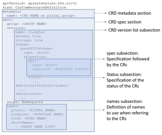 - API extensions: Kubernetes works with a set of native or built-in resources used to deploy, run and manage the required Kubernetes resources, such as, Pods, Deployments, Nodes or Services. Most of the users will have their requirements met with these. However, user-defined resources can be added to the Kubernetes API. These new resources are called Custom Resources (CRs) and are usually implemented by declaring resource types or schemas in Kubernetes through CRDs. When a new resource type is added to Kubernetes using CRDs, all of the Kubernetes tools, such as kubectl (CLI tool for Kubernetes), can be used to interact with them. From the Model-Driven Engineering (MDE) point of view, CRDs act as meta-models that define the characterization and composition rules of the different resource types, while CRs are models or instances of a certain CRD.