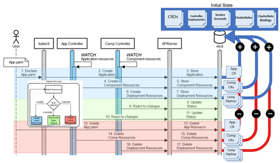 The composition of Controllers and custom resources constitutes what Kubernetes calls the operator pattern [37]. Each kind of CR has a Controller responsible for its management and Controllers follow the Kubernetes control loop (constantly watching their associated resources and accordingly acting when detecting deviations between the desired resource specification and the actual in-cluster resource state).