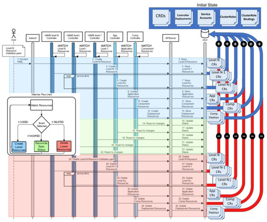 At runtime, each level of the HAMS is implemented by a Supervision Infrastructure Component aware of the resources of its level and is responsible for the management of the elements of its lower level. Details of the HAMS implementation within the Kubernetes orchestrator can be found in Section 4.2.