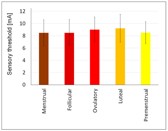 When analyzing the impact of monthly cycle on the sensory threshold, the following phases were identified: menstrual, follicular, ovulatory, luteal, and premenstrual. The number and percentage of women experiencing each phase were as follows: menstrual, N = 42 (20.49%); follicular, N = 36 (17.56%); ovulatory, N = 43 (20.98%); luteal, N = 52 (25.37%); premenstrual, N = 32 (15.61%). There were no significant differences in the sensory threshold in relation to the phases of a woman’s monthly cycle (F = 1.25; p = 0.290). The mean threshold in each menstrual phase was: menstrual, 8.47 mA; follicular, 8.47 mA; ovulatory, 9.01 mA; luteal, 9.22 mA; premenstrual, 8.51 mA (Figure 2).