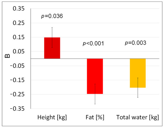 Correlations between most of the women’s body parameters were very high (Table 5), and for this reason, the least correlated parameters (i.e., height, fat, and total body water) were chosen to construct a multiple regression model. This model was statistically significant (F = 6.69, p < 0.001) and, when each of the other parameters was controlled, the selected body parameters in the regression model had a statistically significant effect on the sensory threshold (Figure 3). The taller the woman, the higher the sensory threshold (B ± SE, 0.15 ± 0.07, p = 0.036), while those with a higher body fat percentage and a higher total water content had a lower sensory threshold (fat: B ± SE: −0.25 ± 0.07, p < 0.001; water: B ± SE: −0.20 ± 0.07, p = 0.003).