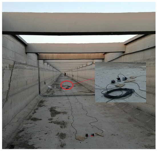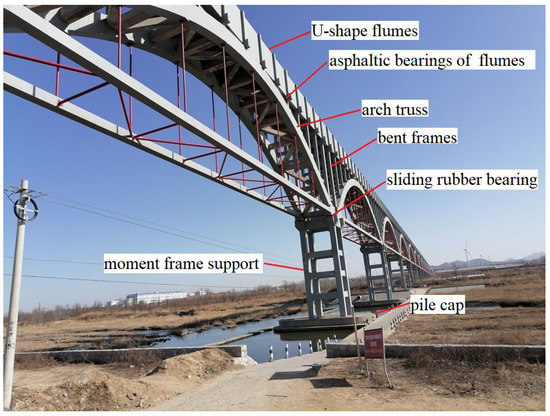 A large concrete aqueduct with a total length of 1083.6 m is a key structure of a water supply project in eastern China. It has 21 spans with a 51.6 m equal span length. The structural feature of the aqueduct is shown in Figure 1, and its main load-bearing components are comprised of arch trusses (concrete design strength C50), bent frames (C40) and moment frame supports (C40). The aqueduct was built in 2006, and after 17 years of operation without any safety monitoring measures, the management now plans to install an SHM on it.