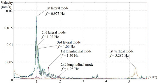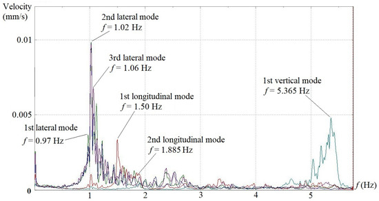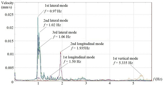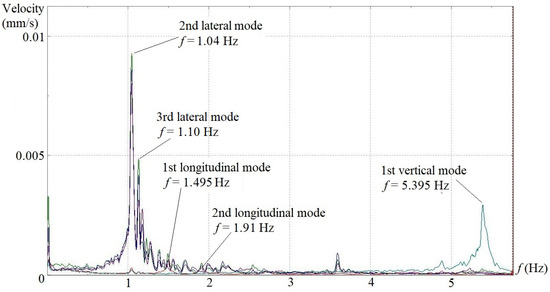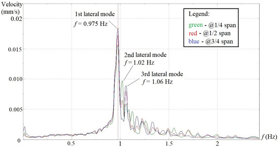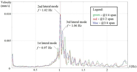 In situ dynamic tests were performed to investigate the structural vibration characteristics of the aqueduct under the natural wind excitation. Velocity transducers were installed on the top surface of the bottom slabs of the U-shaped flumes at locations of 1/4, 1/2 and 3/4 spans for span 6, 8, 10 and 14 (see Figure 2). A three-directional transducer layout, as shown in Figure 3, was adopted at the 1/2 span along the lateral, longitudinal and vertical directions, whereas only lateral and longitudinal transducers were placed at 1/4 and 3/4 spans. The 4 spans were tested individually. A sampling frequency of 20 Hz, which corresponds to a sampling interval of 50 ms, was set, and the total sampling time was fixed as 10 min. In the final data processing, an FFT point of 4096, Hanning window and 1/2 data-segment overlap were chosen, which gave rise to a 0.005 Hz resolution in the frequency domain spectra. Under the aforementioned testing setups and analysis parameters, the velocity spectra in the frequency domain for all transducers in three directions of the 4 spans are shown in Figure 4, Figure 5, Figure 6 and Figure 7. To better show the consistency of test results, two typical spectra obtained from 3 lateral sensors (@ 1/4, 1/2 and 3/4 span) on span #8 and #10 are also provided (see Figure 8 and Figure 9). On the velocity spectrum of each span, the peak amplitude frequencies obtained from the data collected by more than 2 transducers in the same direction (lateral or longitudinal) but at different locations well coincide with one another.