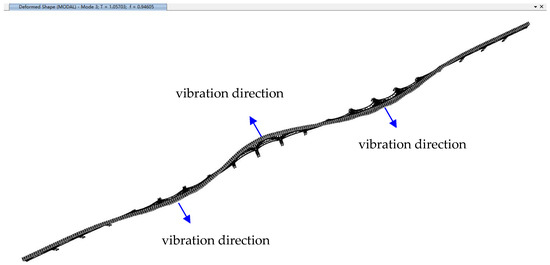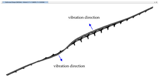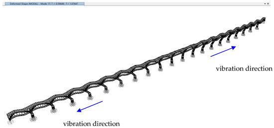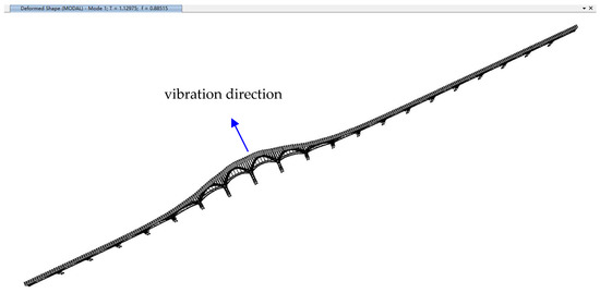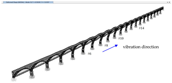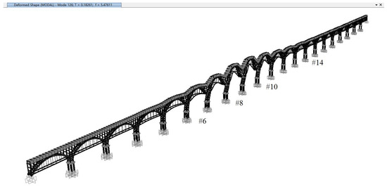 The first vertical modes of the aqueduct for all analysis scenarios have modal participating mass ratios around 20%, typically displaying a simultaneous vertical vibration shape of arch trusses in most interior spans, as shown in Figure 15. In fact, there still exist one or two similar vertical modes which have slightly lower or higher frequencies but much less modal participation mass ratios than that primary mode, and this may explain the small differences of the first vertical mode frequencies obtained from the field dynamic tests of the four spans, as shown in Figure 4, Figure 5, Figure 6 and Figure 7.