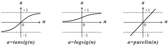 MATLAB is used to perform the BP neural network modeling and approximation. The purelin, tansig and logsig transfer functions are illustrated as shown in Figure 16: