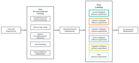 After collecting the data, we cleaned the data by applying Python code to remove stop words, non-alphanumeric characters, duplicated requirements, and word stemming, and transformed each word to lowercase. Data cleaning is crucial to ensuring that the requirements are readable and easy to process. We have 7061 software requirements based on 100 SRS (Figure 3).
