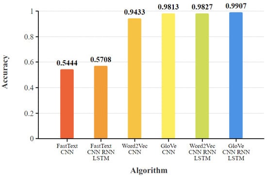 Using the prepared datasets for the ACM, we present the training results of the algorithms for the ACM in Table 6, based on its performance in the ambiguity classification of software requirements. To calculate the ambiguity for each requirement in the ACM, each requirement was separated into a single word based on the type of ambiguity. The table presents the evaluation metrics, including accuracy, recall, precision, and F-measure for each model. Figure 4 illustrates the accuracy of the algorithms. Based on the results, the GloVe_CNN_RNN_LSTM model achieved the highest score of 0.9907 for accuracy. The F-measure score, which shows the balance of precision and recall, 0.9664 and 0.9598 respectively, was also high, indicating the model’s ability to balance the classification of ambiguities. Therefore, the GloVe_CNN_RNN_LSTM model is considered the highest-performing model and will be chosen for the next stage of the project.