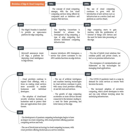 Cloud computing has evolved significantly since the concept emerged in the 1990s. In the 2000s, the use of cloud computing continued to grow with the introduction of new services, such as IaaS and PaaS. In the 2010s, edge computing gained traction with the rise of IoT devices and the need for faster data processing at the edge [26]. Fog computing and open-source platforms for edge computing also emerged during this time. Hybrid cloud solutions and containerization with Kubernetes became key technologies for managing cloud applications in the late 2010s. In 2020, the COVID-19 pandemic led to a surge in demand for cloud services, and serverless computing became more widely adopted [27]. In 2021, AI and ML technologies in cloud services continued to grow, and edge computing saw increased adoption. In 2022, cloud providers focused on making their services more accessible to smaller businesses and individuals while also increasing cloud-based security solutions. Finally, in 2023, quantum computing technologies and blockchain technology are expected to have an impact on cloud computing, with cloud providers offering quantum computing services and blockchain-as-a-service solutions. Figure 9 illustrates the evolution of edge/cloud computing.