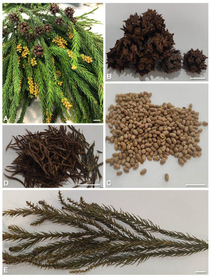 (A) Fresh leaves and strobili (female and male cones) of Azorean Cryptomeria japonica. (B–E) Dried Azorean C. japonica aerial parts utilised in this study: (B) female cones, (C) male cones, (D) leaves (needle-shaped), and (E) foliage. Bar = 1 cm.