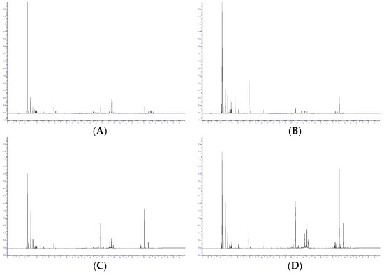 The chemical composition of the EOs obtained from different Azorean C. japonica parts are detailed in Table 2, and their chromatographic profiles are shown in Figure 2A–D.