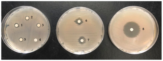 Examples from images of the antimicrobial activity experiments by disc diffusion method against Bacillus licheniformis. Legend: 1—female cones; 2—male cones; 3—foliage; 4—negative control; 5—leaves; 6—α-pinene; 7—terpinen-4-ol; 8—kanamycin.