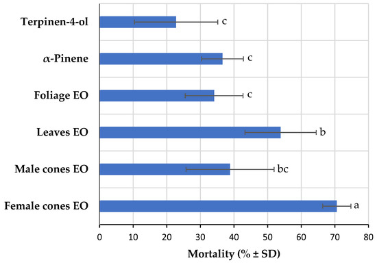 Toxicity of the essential oils (EOs) from different Azorean Cryptomeria japonica parts and some of their components against Artemia salina nauplii at 100 µg/mL. Within each bar, means followed by the same letter are not significantly different at p < 0.05.