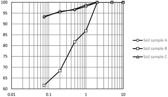 In order to analyze the gradation composition of soil samples with a particle size range of 0.075~60 mm, a particle screening test was carried out by Highway Geotechnical Test Procedure JTG3430-2020. The test steps are as follows: Firstly, the samples were weighed according to the regulations, and the samples were passed through a 2 mm sieve in batches. Samples larger than 2 mm were passed through coarse sieves at all levels larger than 2 mm from a large to small order. The soil left on the sieve is weighed separately. If the amount of soil under the 2 mm sieve is too much, it can be reduced to 100~800 g by quartering. Samples less than 2 mm were passed through a fine sieve at all levels from a large to small order. Shaking can be carried out by a shaker. The shaking time is generally 10~15 min. Starting from the sieve with the largest pore size, each sieve is taken down in sequence, and shaken with the hand on the white paper until the number of sieves per minute is no more than 1% of the residual mass of the sieve. The leaking soil particles should be put into the next sieve, and the soil samples left on each sieve should be brushed with a soft brush and weighed separately. The difference between the total mass of the soil under the sieve and the total mass of the sample before the sieve should not be greater than 1% of the total mass of the sample before the sieve. Finally, three soil sample gradations are obtained through experiments, as shown in Figure 2. Figure 2 shows that the mass percentage of soil sample A (less than 0.075 mm) is 93.2%, the mass percentage of soil sample B (less than 0.075 mm) is 61.8%, and the mass percentage of soil sample C (less than 0.075 mm) is 93.5%.