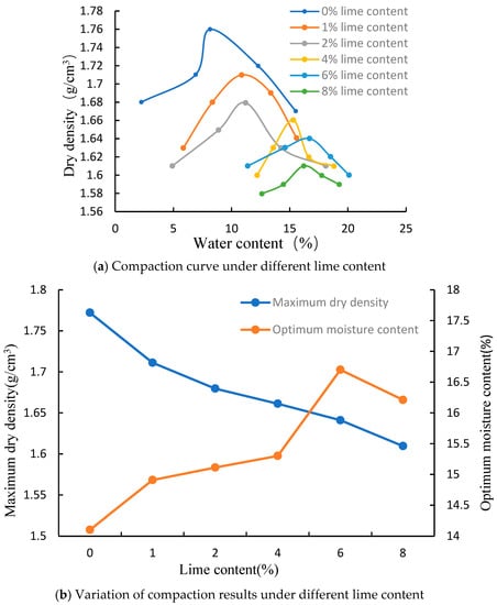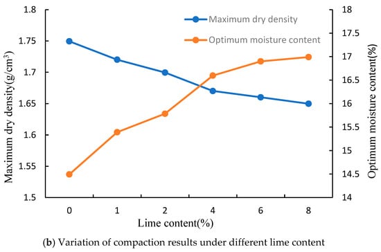 Ion exchange, carbonation, and crystallization will occur throughout the process of enhancing low liquid limit clay with lime mixing, resulting in an increase in the plastic limit of each soil sample with an increase in lime concentration and a corresponding decrease in the plastic index. On the one hand, the interchange of Ca2+ in the lime with other cations on the surface of the soil particle is what causes the water loss of the improved soil. On the other hand, more water is required to produce the best compaction effect because the dissolution and hydration of lime in the soil causes soil to be compressed in real time [18].