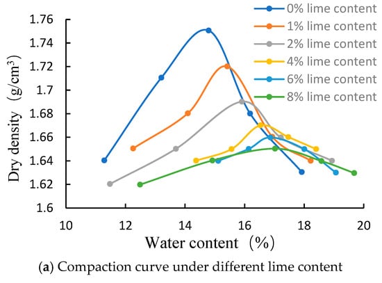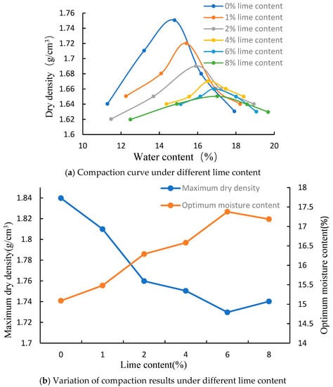 A compaction test is a technique that involves hammering soil samples to determine the soil’s propensity for compaction. This technique involves hammering soil samples with varying water contents using various compaction techniques to produce the maximum dry bulk density and ideal water content, which serves as the foundation for the design and construction of filling engineering. Samples were made with varying amounts of lime content, including 0%, 1%, 2%, 4%, 6%, and 8%. Dry heavy compaction was used in the compaction test, with 3 compaction layers and 98 compaction times for each layer. After compaction was completed, the sample in the cylinder was pushed out with the demolding instrument to determine the wet density of the sample, and then the representative soil sample was taken from the center of the sample to measure its water content, which was calculated as 0.1%.