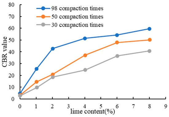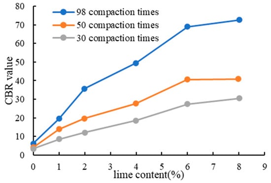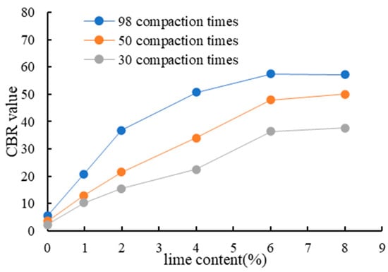 The carrying capacity of soil foundation materials and the soil foundation’s resistance to deformation are measured using the CBR value. It is an important signal while constructing a roadbed. The bearing capacity of a material is defined as its ability to endure deformation under a local load, and standard gravel is used as the benchmark. This capacity is denoted by their relative ratio CBR value. Prior to the experiment, the specimen that has been prepared in accordance with the test guidelines must be immersed in water. In order to calculate the change in the humidity density of the specimen, the specimen is weighed after being removed from the solution and allowed to drain for 15 min. Following the results of the last compaction test, the sample for this test was prepared using 30, 50, and 98 compaction times. During sample preparation, the lime content was still 0%, 1%, 2%, 4%, 6%, and 8%, and the ideal moisture content was chosen. The results of the CBR test are displayed in Figure 8, Figure 9 and Figure 10.